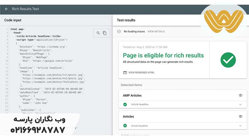 بعد از اینکه اسکیما را وارد کردید، از ابزار Rich Results Test گوگل استفاده کنید تا ببینید آیا صفحه شما شرایط لازم برای نمایش ریچ ریزالت را دارد یا نه و آیا خطا یا هشدار خاصی وجود دارد.